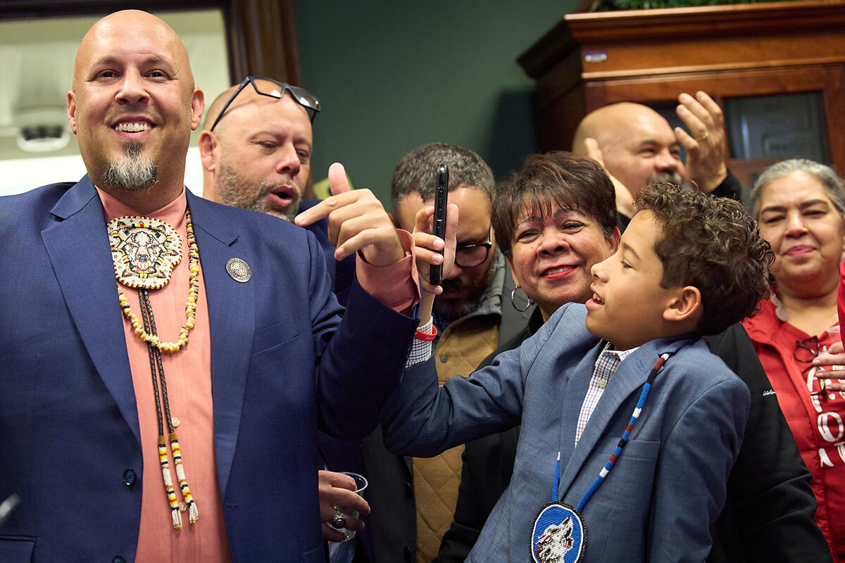 North Carolina state Rep. John Lowery, left, the chairman of the Lumbee Tribe of North Carolina, is recorded by 11-year-old Austin Curt Thomas, 11, as they celebrate passage of a bill granting their tribe federal recognition, on Capitol Hill in Washington, Dec. 17, 2025.