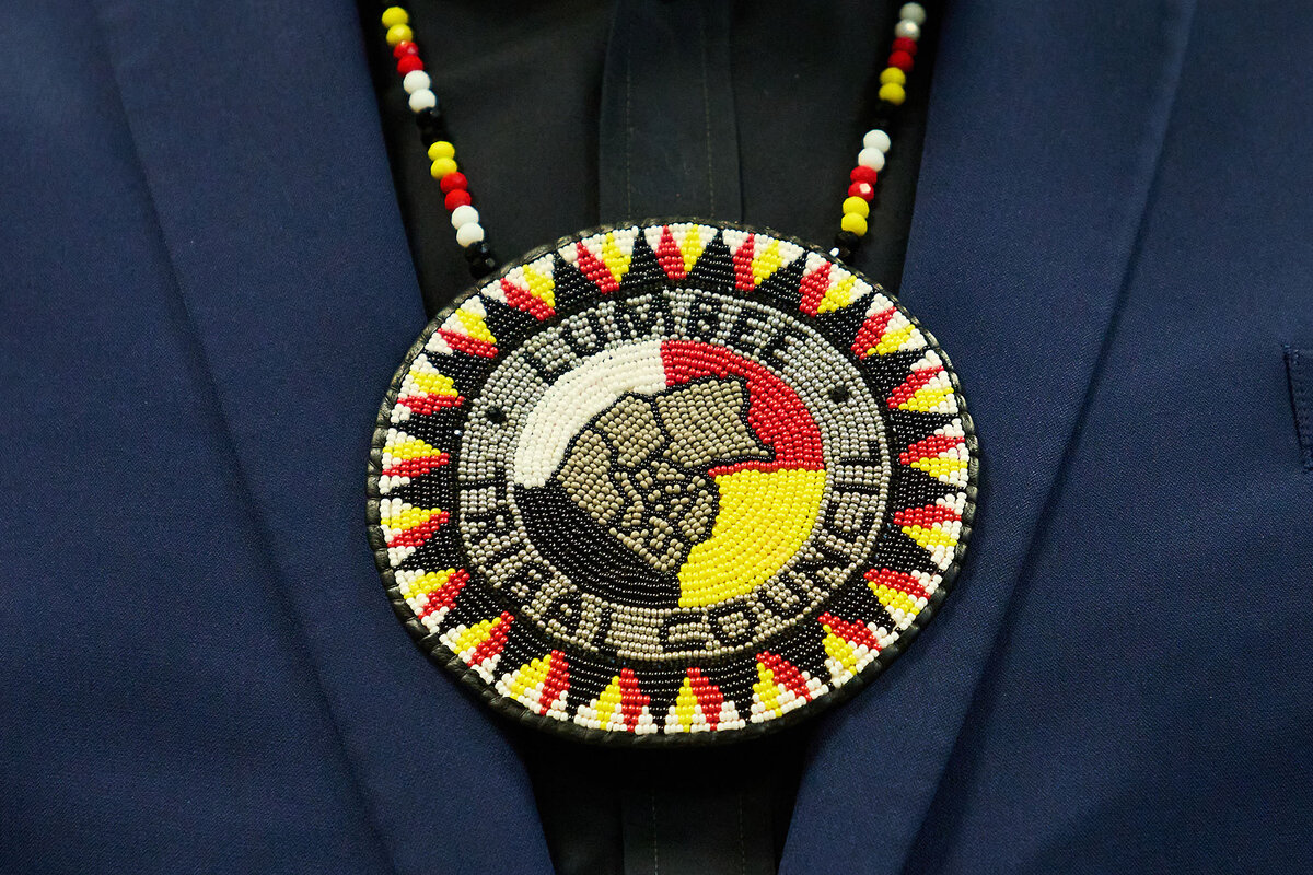 A tribal symbol is visible as a member of the Lumbee Tribe of North Carolina attends a celebration after the passage of a bill granting the tribe federal recognition, on Capitol Hill in Washington, Dec. 17, 2025.
